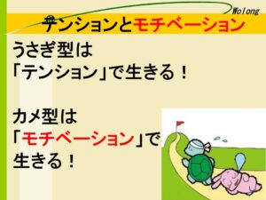 人の気質には、テンション気質(ウサギ気質)とモチベーション気質(カメ気質)があります。ウサギはカメを見ていて油断し、負けてしまいます。カメはゴールしか見ていません。そして昨日よりゴールに近づいた自分を見て、自己肯定感を上げ続けます。つまりモチベーションは、環境変化でもブレないものです。「落ちた」時点で、それはテンションであって、モチベーションではありません。