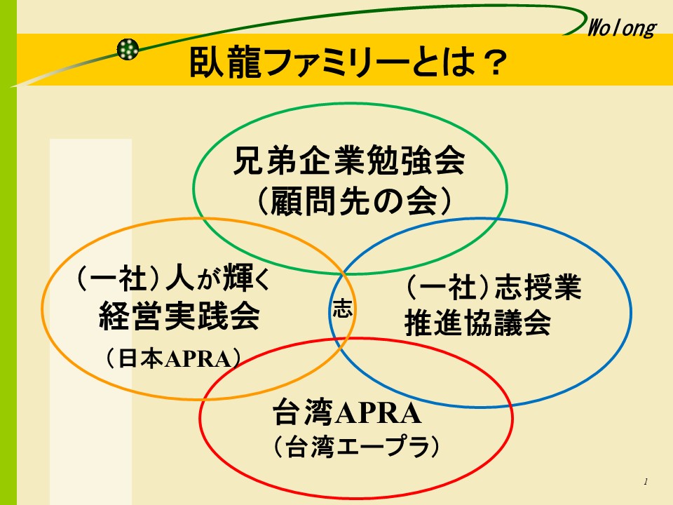 ・1995年(39歳) 臥龍が議長となり「人本主義経営を実践する日台事業家交流会:APRA(エープラ)」が発足し、年に一度の「国際交流研鑽会」がスタート。回数を重ねることで「APRAファミリー(大家族)」の絆が深まり続けている。